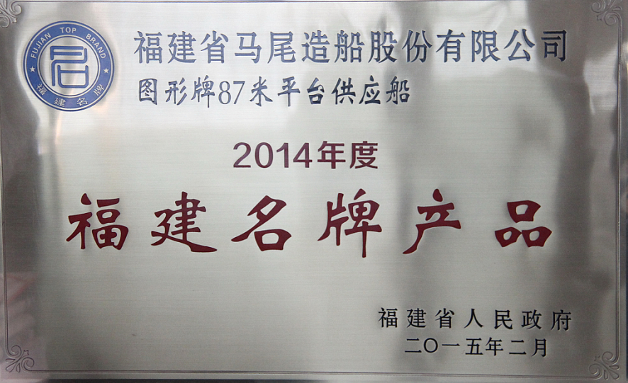 馬尾造船87米平臺(tái)供應(yīng)船榮獲福建省人民政府2014 年度“福建名牌產(chǎn)品”